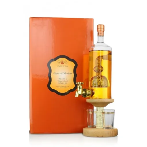 ‘This is a Mini Pot Still shape inserted in a bottle and filled with barley, and includes a working tap, wooden stand and 2 glasses. Filled with 350 ml of Highland Malt Whisky. Once the whisky is gone simply refill with your favourite tipple!’