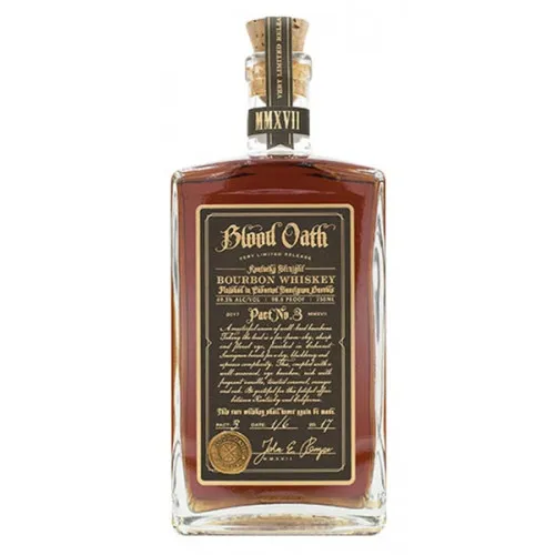 Blood Oath Bourbon Pact No. 3 has a very dark, amber color and an aroma of vanilla, caramel, stone fruit, cocoa and oak. The palate is sweet and spicy, with notes of vanilla caramel and apricots, and leads to an unforgettably smooth finish marked by a slightly spicier finish which does not affect the incredible smoothness of this high-proof masterpiece.